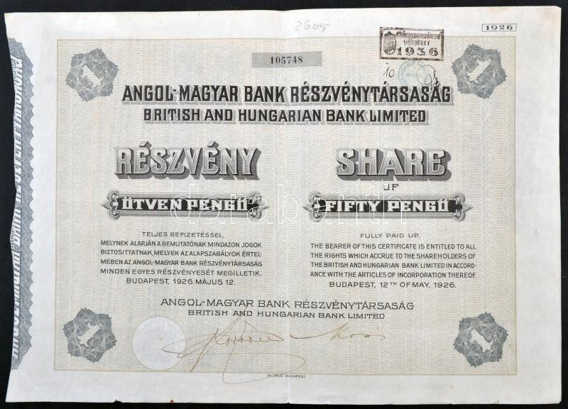 Budapest 1926. "Angol-Magyar Bank Részvénytársaság" részvénye 50P-ről,... https://www.darabanth.com/hu/269-Gyorsarveres/269.0/Numizmatika/Reszvenyek-es-sorsjegyek~400005/Budapest-1926-Angol-Magyar-Bank-Reszvenytarsasag-reszvenye-50P-rol-szelvenyekkel-szara~II1356051