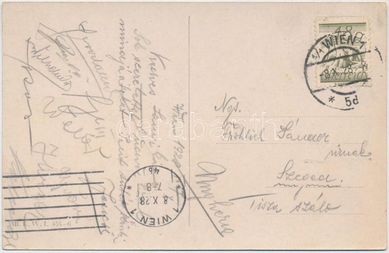1928 A magyar válogatott tagjainak (Hirzer Ferenc, Biri János, Fogl József, Webner Lajos, stb.) aláírásai Bécsből Fröhlich Sándor (1897-1982) labdarúgó részére küldött levelezőlapon