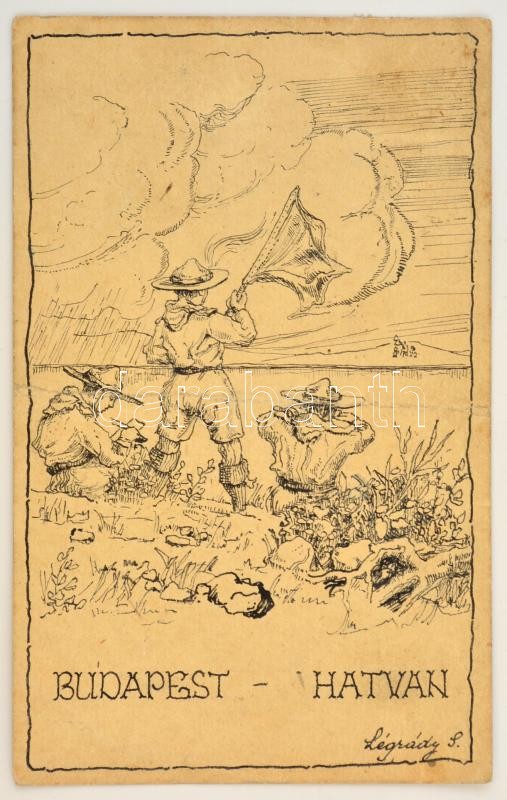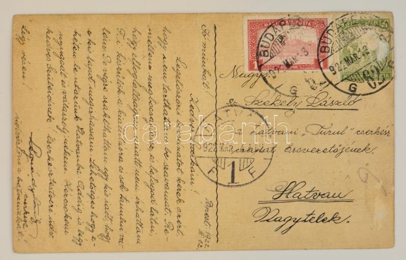 1922 Légrády Sándor (1906-1987) festő, bélyegtervező személyes hangvételű levele Székely László (?-?) a hatvani Turul cserkészcsapat örsvezetőjének, általa tervezett levelezőlapján, törésnyommal