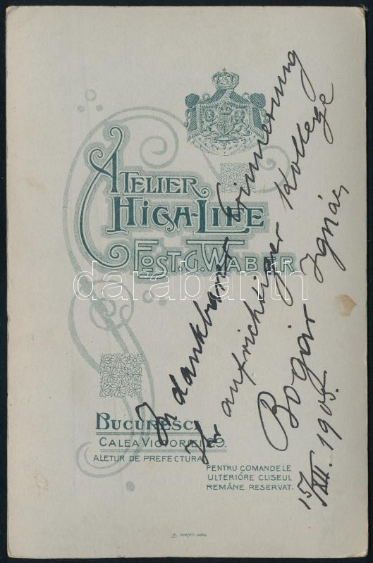 Leírás: 1905 Bogár Ignác (1876-1933): nyomdász, szociáldemokrata pártpolitikus, szakszervezeti vezető műtermi fotója, Fost. G. Waber Bukarest műterméből, 16x10,5 cm