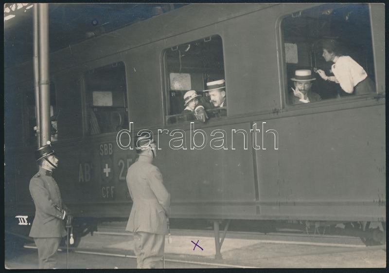 1917 I. Konstantin (1868-1923) görög király és neje, Zsófia királyné (1870-1932), porosz királyi hercegnő elutazás Luganoból. Feliratozott fotó / Constantine I. king of Greece and his wife, queen Sophia. Departure from Lugano 14x9 cm