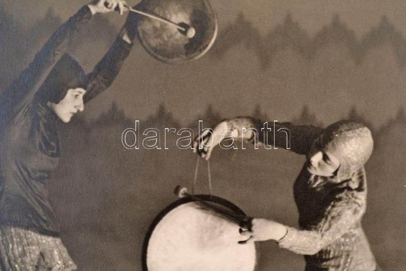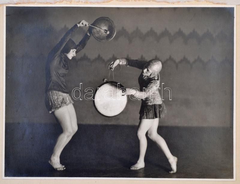 1929 Hegyei Tibor (1898-1935): Dob gong, Bokor Kata, feliratozott, vintage fotóművészeti alkotás Szentpál Olga mozgásművészeti iskolájának archívumából, 17x23 cm, karton 24,5x33 cm