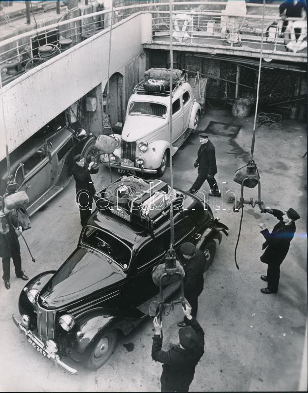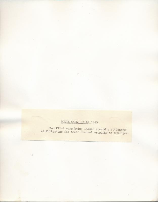 1949 Monte Carlo Ralley V-8 Pilot autói az s.s. Dinard fedélzetén, hátoldalon feliratozott sajtófotó, 26x20,5 cm / Monte Carlo Ralley V-8 Pilot, press photo, 26x20,5 cm