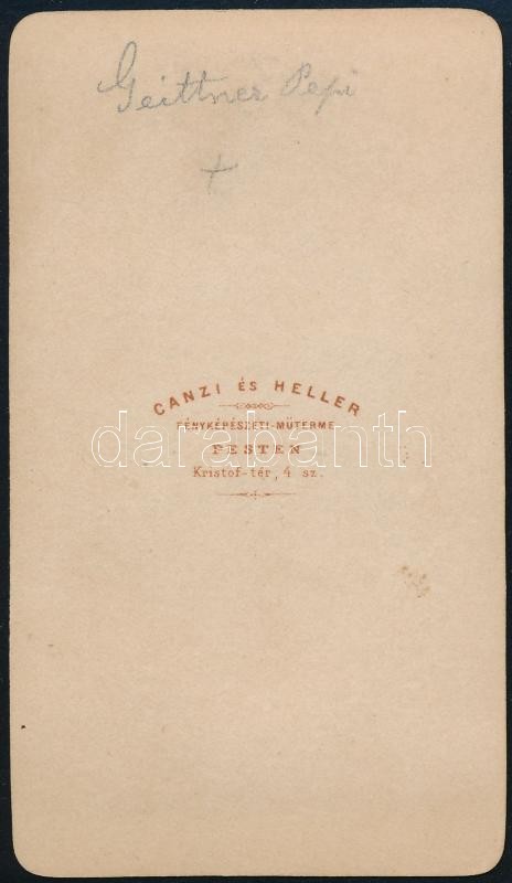 Leírás: cca 1860 Geittner Pepi feliratozott, vizitkártya méretű fényképe, Canzi és Heller pesti műterméből, 10,5x6 cm