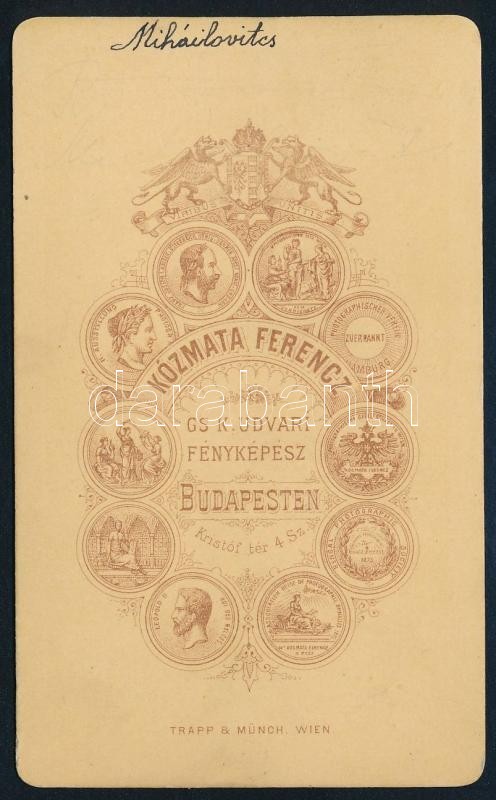 cca 1875 Miháilovitcs feliratozott, vizitkártya méretű fényképe, Kozma... https://www.darabanth.com/hu/27-Nagyaukcio/27.1/Festmeny-mutargy-papirregiseg-egyeb/Foto~10914/cca-1875-Mihailovitcs-feliratozott-vizitkartya-meretu-fenykepe-Kozmata-Ferencz-cs-k-udvari~II1571706