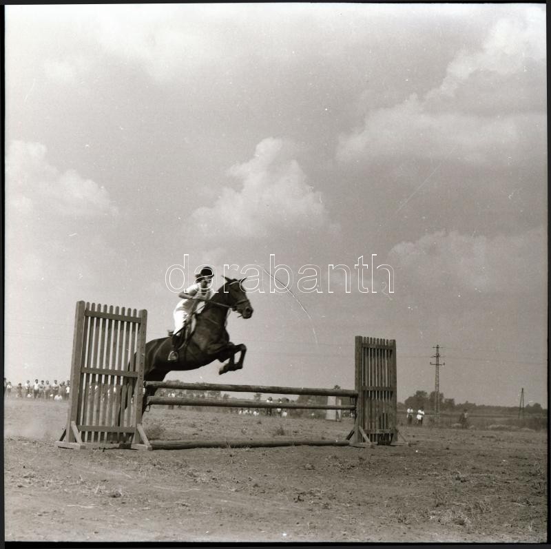 Leírás: cca 1968 Sinka Antal hagyatékából: lovas díjugrató verseny, 13 db vintage negatív, 6x6 cm