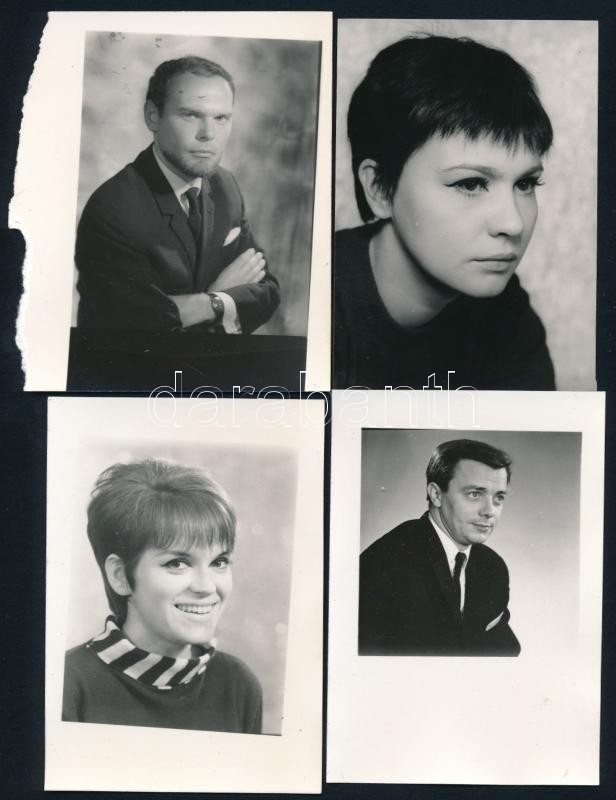 cca 1969 Színészek és énekesek: Amrus Kiri, Almási Éva, Lőte Attila, Araczki László portréja, 4 db szabadon felhasználható vintage negatív és az ezekről készült 4 db vintage nézőkép, 7x6 cm