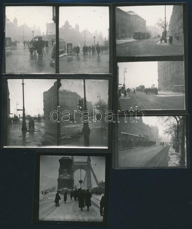 Leírás: cca 1942 Budapesti villamosok, utcaképek, 8 db későbbi kontakt kép korabeli negatívokról, 4,5x6,5 cm és 6x6 cm