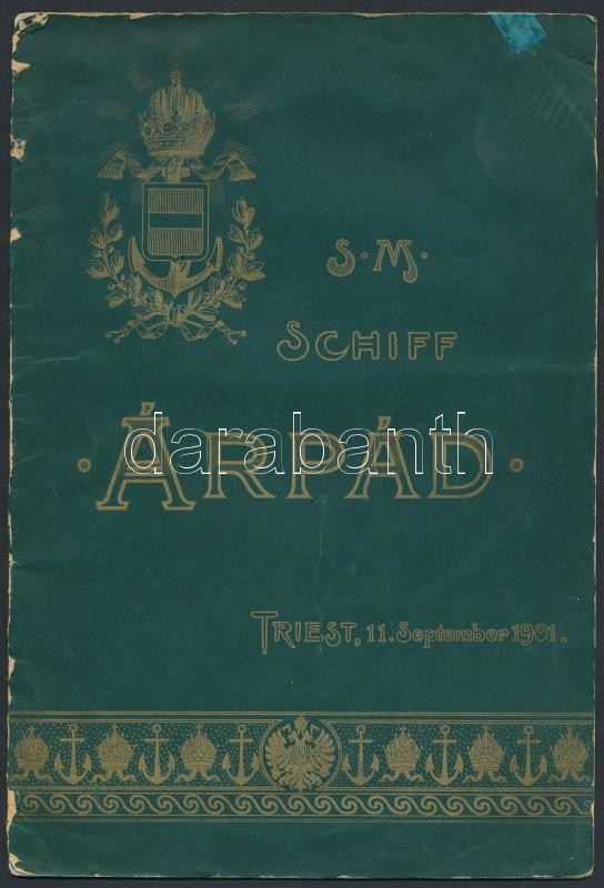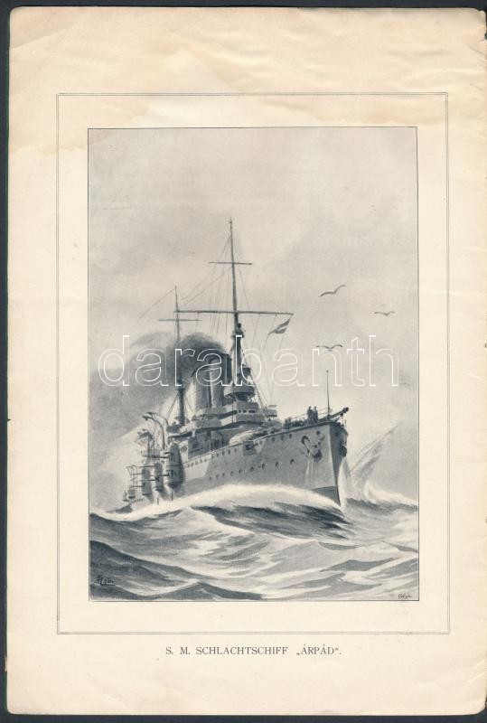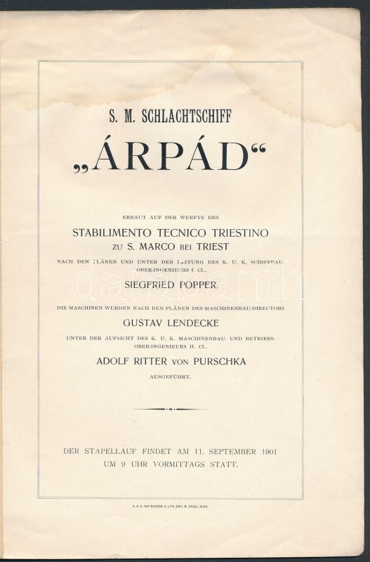 1901 S. M. Schlachtschiff "Árpád". Bécs, Emil M. Engel., 1 t.+10 p. Kiadói tűzött papírkötés, kissé kopottas borítóval, foltos lapokkal, német nyelven. S.M.S. Árpád K.u.K. haditengerészet Habsburg-osztályú csatahajójának vízrebocsájtására kiadott hivatalos ismertető. / 1901 S. M. Shlachtschiff "Árpád". Vienna, Emil M. Engel. Paperbindig, with a little bit worn cover, with spotty pages, in German language. The official launching brochure of S.M.S. Árpád K.u.K. Navy Habsburg-class pre-dreadnought.