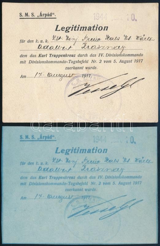 1917 "Károly-csapatkereszt" kitüntetés viselésére jogosító igazolvány, az SMS Árpád csatahajó legénységének egy tagja számára kiállítva, 'K.u.K. Kriegsmarine SMS Árpád' pecséttel, másolatával, 9x11,5 cm / "Karl Troop Cross" decoration certificate for mariner of SMS Árpád, with 'K.u.K. Kriegsmarine SMS Árpád' seal, with copy, 9x11,5 cm