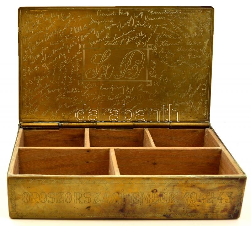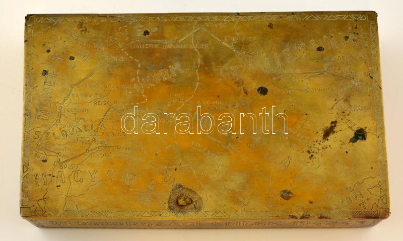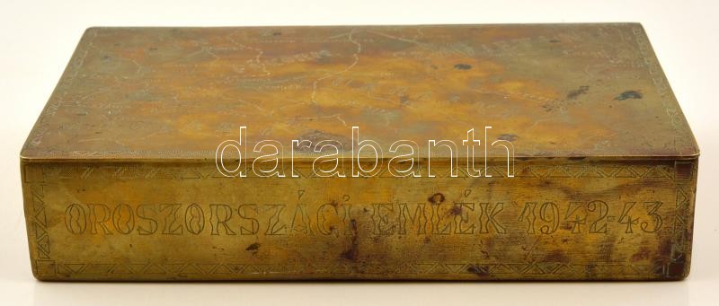 1943 Oroszországi emlék. Réz doboz belekarcolva a magyar csapatok vonulásának útvonala, térkép és a katonák nevei. / 1943 Memory from the eastern front. Copper box with map of the Russian battlefields and the route of the Hungarian toops. 24x5x14 cm