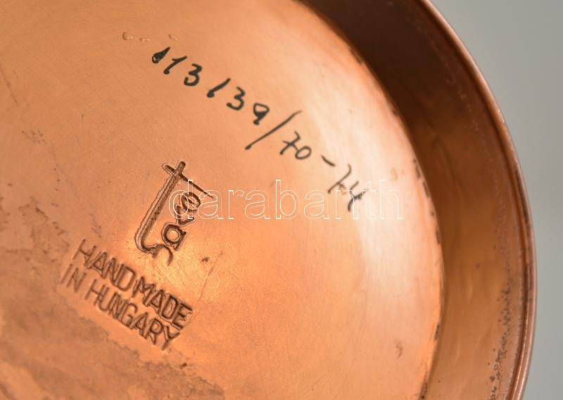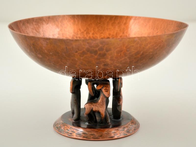 Leírás: Tevan Margit (1901-1978): Talpas kínálótál, kecske figurákkal, vörösréz, jelzett, m:10 cm, d:17 cm