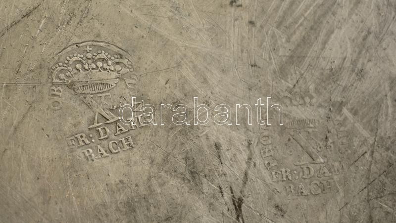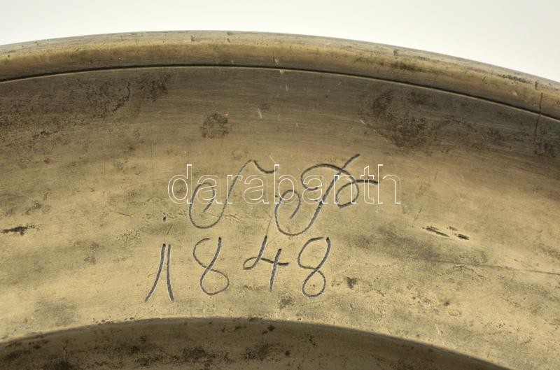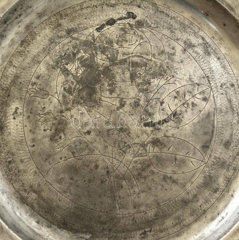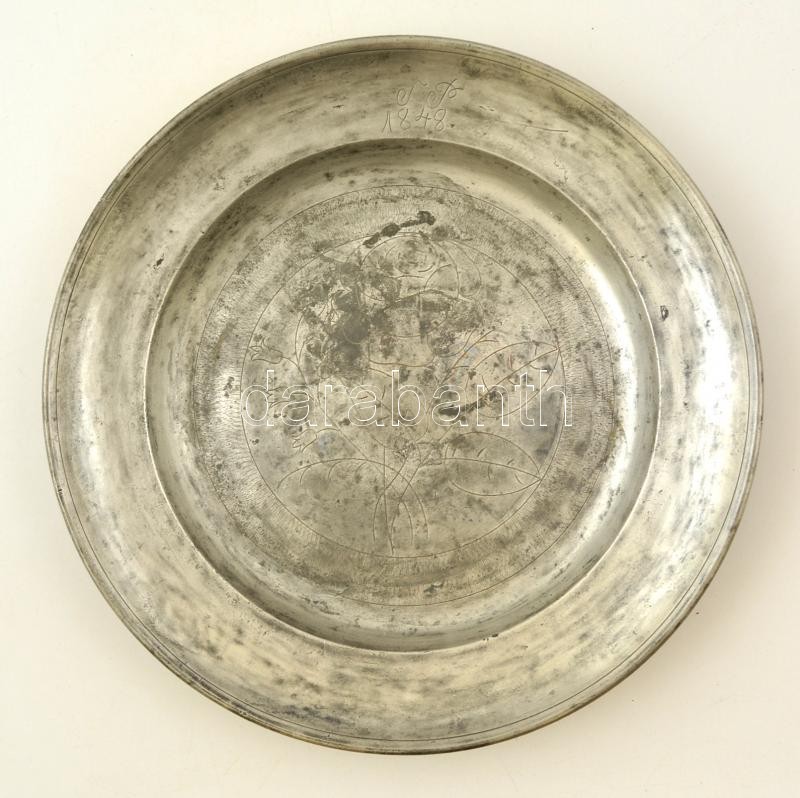 cca 1835-1848 Nagyszebeni ón tál, Franz Dambach (?-1885), poncolt, vésett, mesterjeggyel, kopásokkal, d: 30 cm / cca 1835-1848 Tin plate from Sibiu made by Franz Dambach (?-1885), with hallmark, signs of wear / Hermannstädter Zinnteller, Franz Dambach (?-1885), mit Zinngießermarke / Farfurie sibiancă din cositor, cu marcă de meşter, d: 30 cm