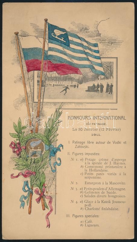 1911 Konkours International du Patinage Nemzetközi Korcsolya Verseny vacsoraestjének illusztrált étlapja, francia nyelven, 25x14 cm./