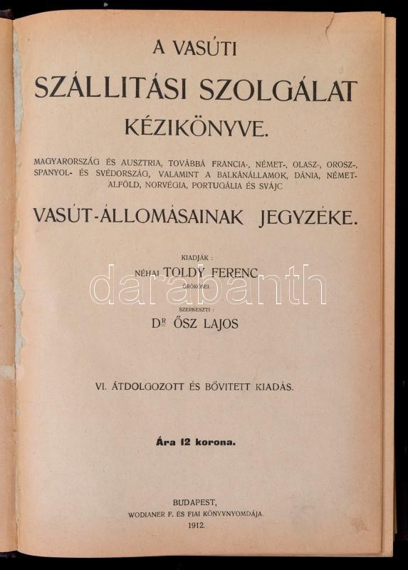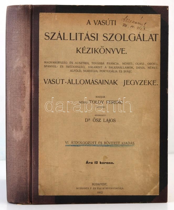 1912 A vasúti szállítási szolgálat kézikönyve. Magyarország és Ausztria, továbbá Francia, Német-, Olasz-, Orosz-, Spanyol- és Svédország, valamint a Balkánállamok, Dánia, Németalföld, Norvégia, Portugália és Svájc vasútállomásainak jegyzéke. Szerkeszti Dr. Ősz Lajos. VI. átdolgozott, bővített kiadás, Wodianer F. és Fiai Könyvnyomdája. Átkötött, félvászon kötésben, jó állapotban. / 1912 Handbook of railway transport, with Hungarian and European countries railway station register, in good condition
