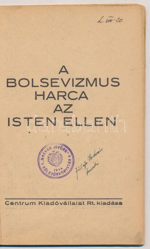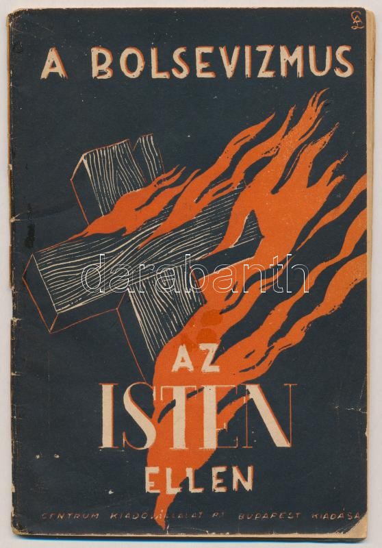cca 1940 A bolsevizmus harca az isten ellen. Bp., é.n., Centrum Kiadóvállalalt Rt., 63 p. Kiadói illusztrált tűzött papírkötés. A mű szerepel az Ideiglenes Nemzeti Kormány által 1945-ben kiadott Tiltott Könyvek listáján. Jó állapotban. Ritka! / Hungarian Anti-Bolshevist booklet, In good condition. Rare!