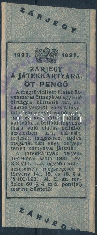 Leírás: 1937 5P kártyajegy, kártya-zárjegy (Hodobay 43.) / 5p card tax-stamp