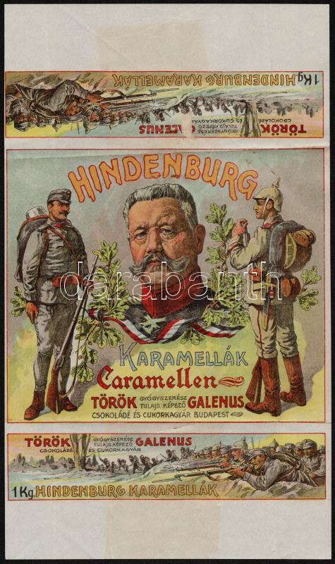 cca 1910-1918 Török Gyógyszerész tulajdonát képező Galenus Csokoládé és Cukorkaárugyár Budapest "Hindenburg Karamellák" litho csomagolópapírja / cca 1910-1918 "Hindenburg Caramellen" litho wrapping paper