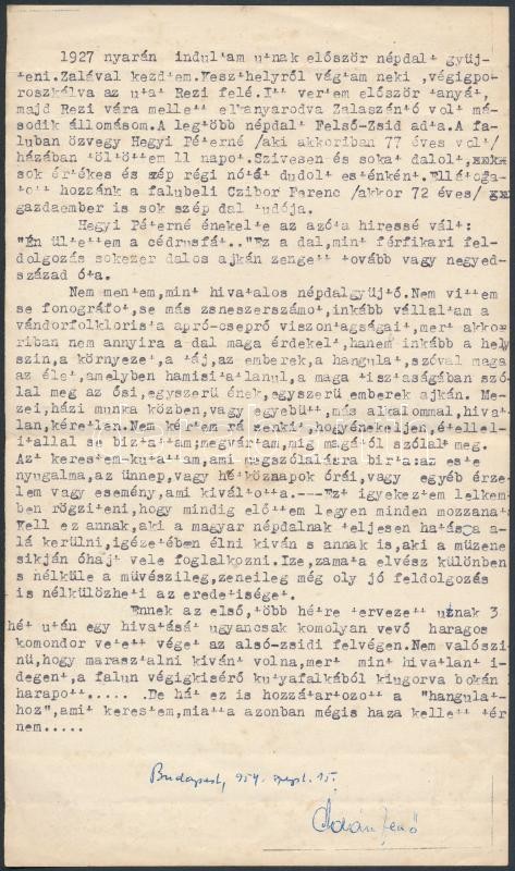 1930-1954 Ádám Jenő (1896-1982) hagyatéka: egy aláírt fotója (12x8 cm.), egy általa lejegyzett népdal kottája, és szövege, valamint egy a népdalgyűjtésről szóló általa aláírt gépelt oldal.