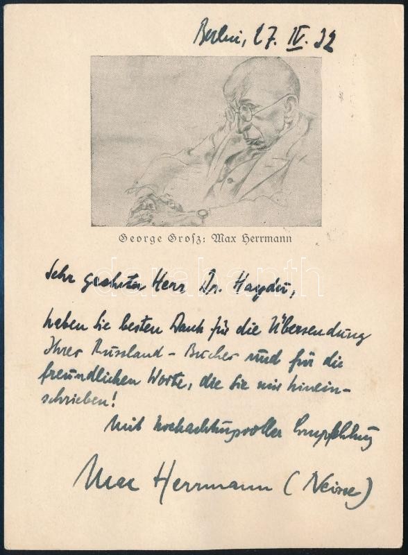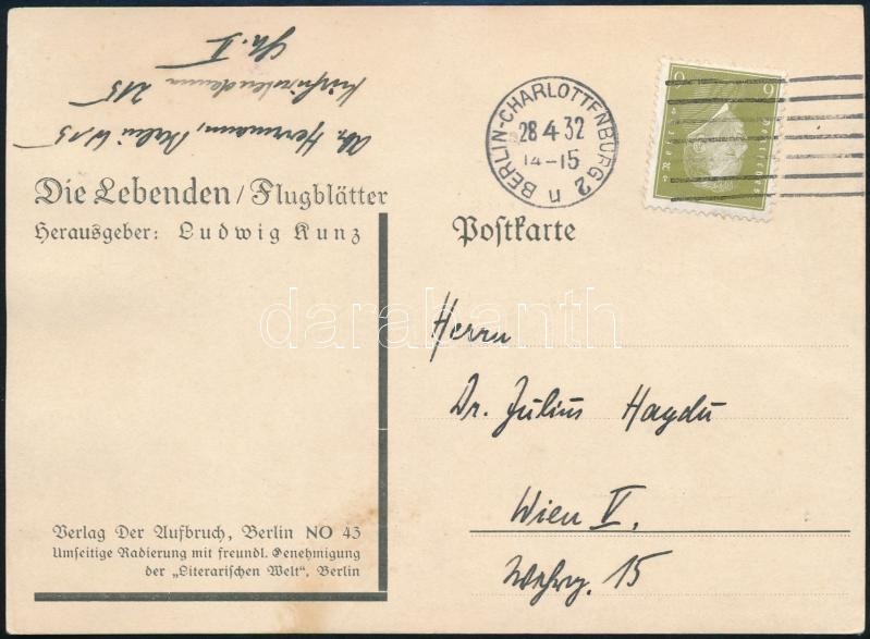 1932 Max Herrmann-Neiße, ( 1886-1941 ) német író saját kézzel írt levelezőlapja Julius Haydn írónak Bécsbe / Autograph postcard of Max Herrmann-Neiße, German writer to Julius Haydn in Vienna