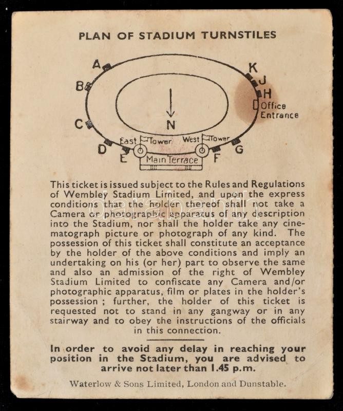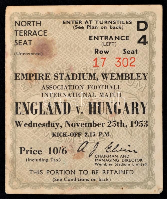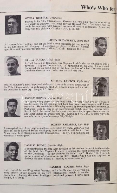 1953 Magyarország-Anglia, a legendás 6:3-as labdarúgó mérkőzés meccsfüzete, és egy belépőjegye a Wembley Stadionba, ahol az Aranycsapat legyőzte az évtizedek óta veretlen Angliát. A füzet kissé viseltes, kissé foltos, kissé kopottas, a jegyen kisebb folt./ 1953 Hungary - England, legendary football match booklet, and a entry ticket to the Wembley Stadium, where the Golden Team of Hungary defeated England. The booklet in little bit spotty, and worn, the ticket little bit spotty.