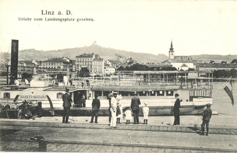 Leírás: Zrínyi Miklós oldalkerekes személyszállító gőzhajó Linz kikötőjében / Urfahr vom Landungsplatz gesehen / Hungarian passenger steamship in Linz