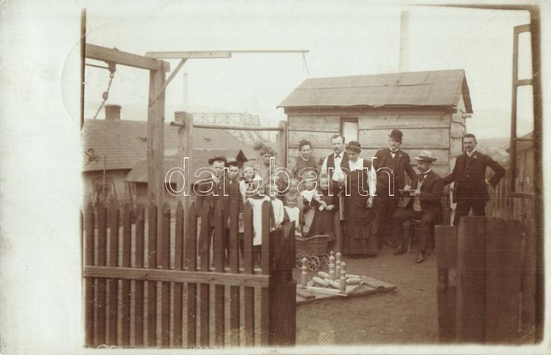Leírás: 1909 Tatabánya, Családi tekézés az udvaron, háttérben a gyárakkal, photo