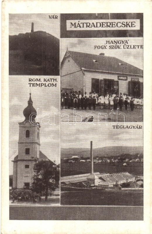 Leírás: Mátraderecske, Vár, Hangya fogyasztási szövetkezeti üzlet, Római katolikus templom, téglagyár