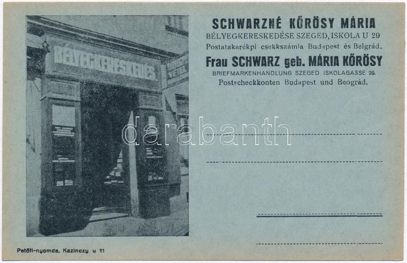 Schwarzné Kőrösy Mária bélyegkereskedése Szegeden. Iskola utca 29. reklámlap / Briefmarkenhandlung / Hungarian stamp dealer shop advertisement from Szeged