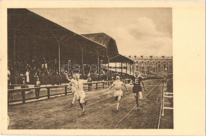 Leírás: 1913 K.A.O.E. verseny, Rákos győz 100 yardon; Weinreb, Rákos, Boros, Schubert; kiadja a Klasszikus Pillanatok Vállalat / Hungarian athlets, runners
