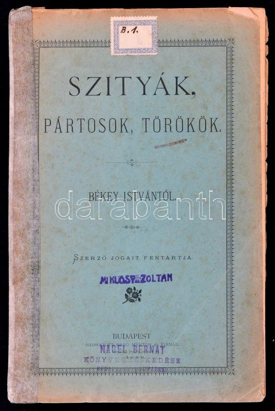 Békey István: Szityák, pártosok, törökök. Bp., 1886, Bagó Márton és Fia. Javított gerincű papírkötés, hiányos borítóval, néhány lapon széljegyzettel. Ritka!