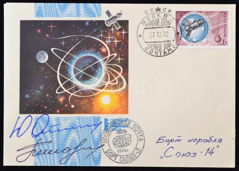 Pavel Popovics (1930-2009) és Jurij Artyuhin (1930-1998) orosz űrhajósok aláírásai emlékborítékon /