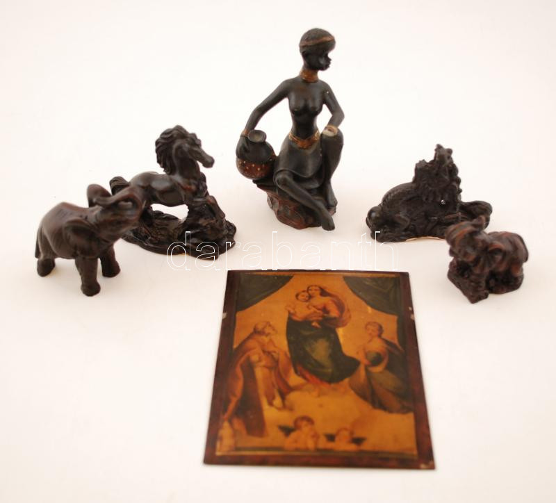 5 db. figura (2 elefánt, 1 ló, 1 sárkány, 1 néger lány korsóval) és 1 db. zománc kép (Mária a kisdeddel.), m.:5-11 cm., 13x10 cm.