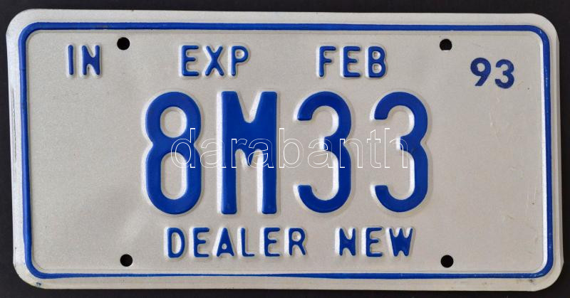 Leírás: "In EXP FEB 93 8M33 Dealer New" feliratú amerikai rendszámtábla. 30x15 cm.