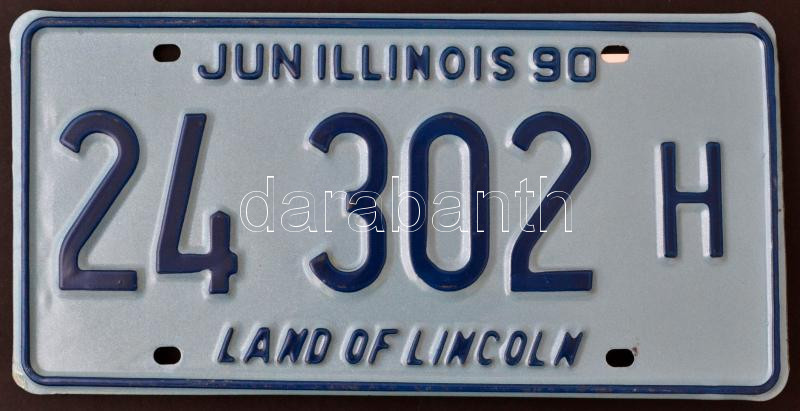 "Jun Illionois 90 24 302 H Land of Lincoln" feliratú amerika... https://www.darabanth.com/hu/270-Gyorsarveres/270.0/Festmeny-mutargy-papirregiseg-egyeb/Bolhapiac~20/Jun-Illionois-90-24-302-H-Land-of-Lincoln-feliratu-amerikai-rendszamtabla-30x15-cm~II1364338
