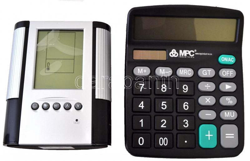 Office Butler asztali multifunkciós digitális eszköz: hőmérő, naptár, óra, tolltartó, saját dobozában, jó állapotban, m: 12 cm + MPC Industries számológép, leírással, saját dobozában, működik