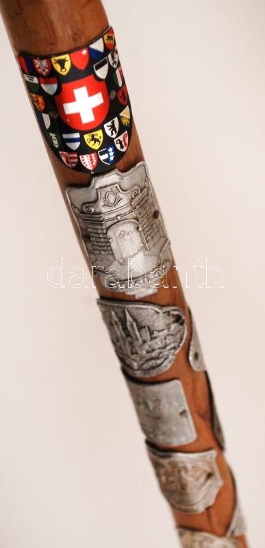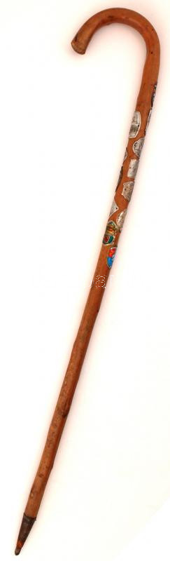 Leírás: Régi fából készült túrabot 13 db különféle, magyar, német, osztrák, városokat ábrázoló jelvénnyel, h: 89 cm