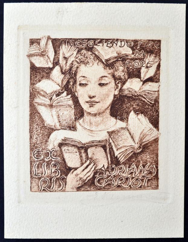 Leírás: Enrico Vannuccini (1900 -1990): Ex libris Adriana Carlot. Rézkarc, papír, jelzett (halványan), 8×7 cm
