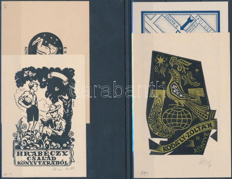 Leírás: Fery Antal (1908-1944):ex libris tétel, fametszet, papír, jelzettek, 4db, különböző méretben, 10x7cm és 12,5x8cm között