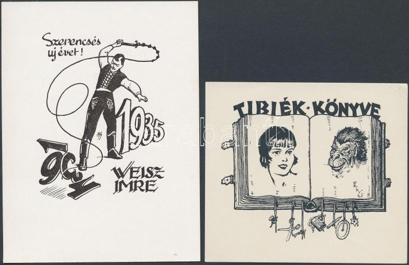 Petry Béla (1902-1996): Tibiék könyve, ex libris, klisé, papír, jelzett a klisén, 8,5×9,5 cm + Balázsfy Rezső (1885-1973): Szerencsés új évet 1935, alkalmi kisgrafika, klisé, papír, jelzett a klisén, 12×9 cm