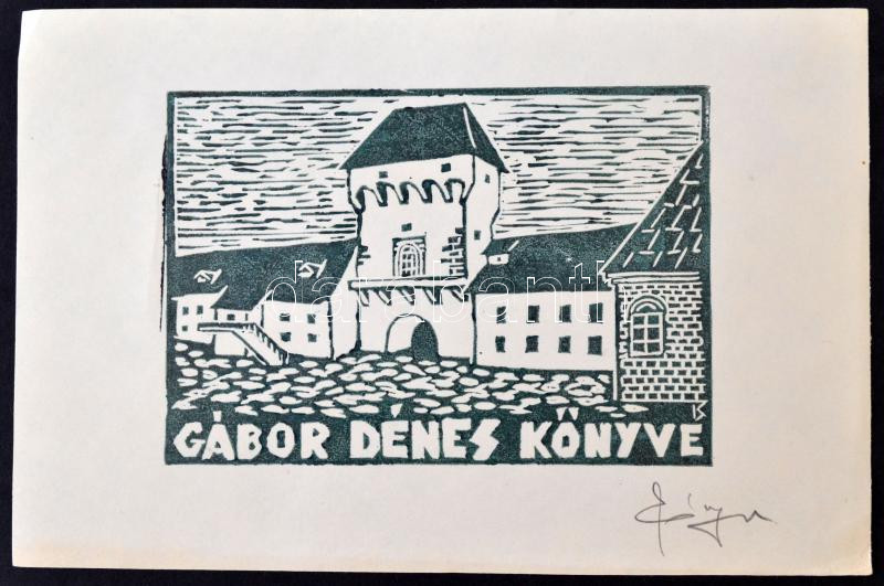 Leírás: Sólyom Sándor (1943-): Ex libris Gábor Dénes. Linó, papír, jelzett, 7×10 cm