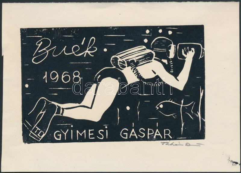 Leírás: Takács Dezső (1933-): Ex Libris, Buék 1968. Linó, papír, jelzett, 7×11 cm