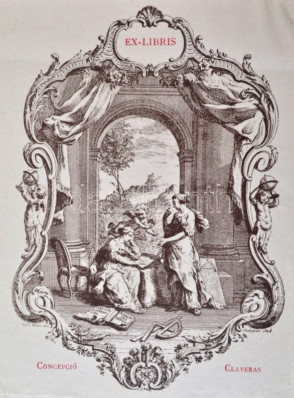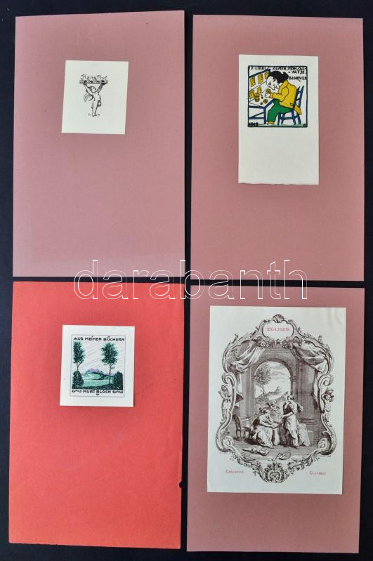 Vegyes ex libris tétel különböző képzőművészektől, klisék és metszetek, egy rész dúcon jelzett, kartonra ragasztva, 4db, különböző méretben és minőségben, 5x5cm és 18x13cm