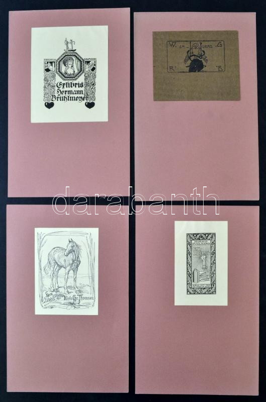 Vegyes ex libris tétel különböző képzőművészektől, klisék és metszetek, egy rész dúcon jelzett, kartonra ragasztva, 4db, különböző méretben és minőségben, 5x8cm és 12x8cm
