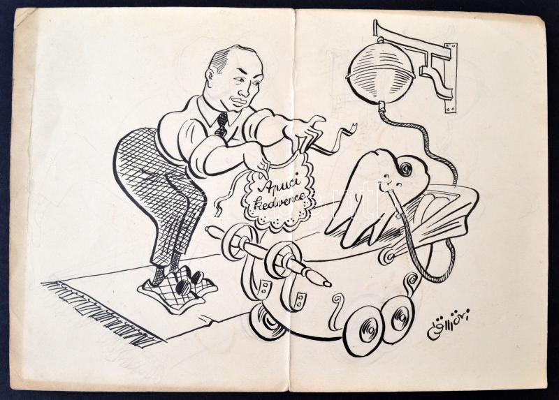 Leírás: Gömöri Imre (1902-1969): Apuci kedvence, humoros fogászati karikatúra, tus, papír, hajtásnyomokkal, 18×25,5 cm