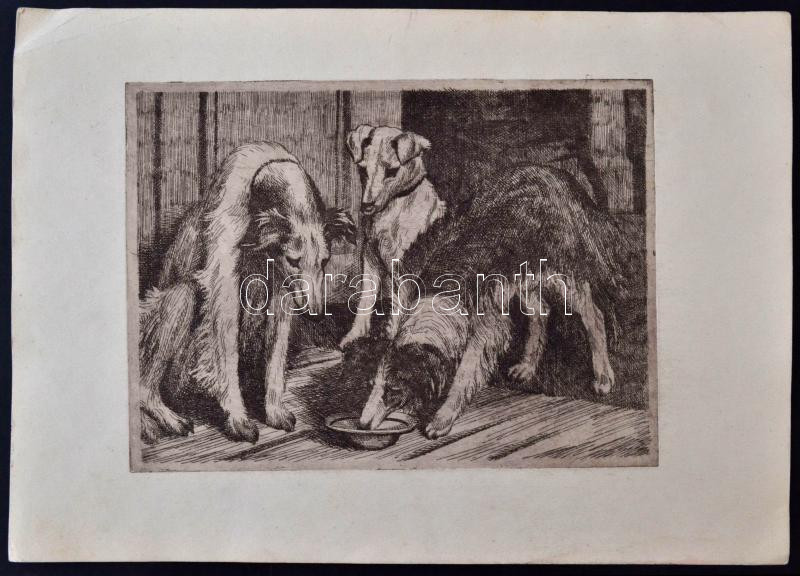 Leírás: Jelzés nélkül: Kutyák, papír, rézkarc, az egyik sarka gyűrött és a hátoldala maszatos, 25x35cm.