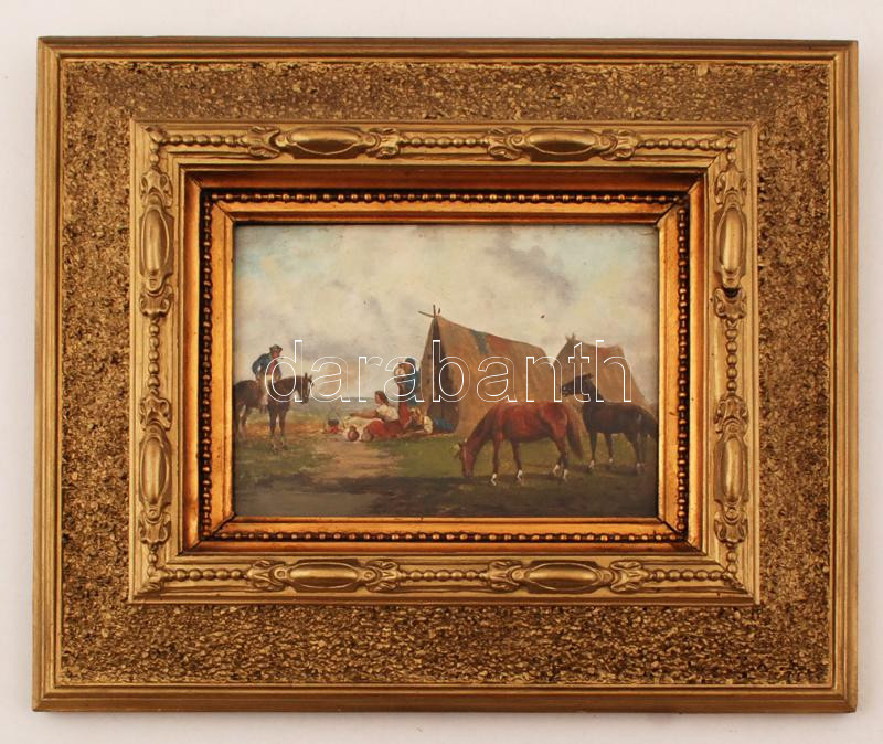 Leírás: Jelzés nélkül: Vándorló cigány család. Olaj, fa , üvegezett keretben, 19×23 cm