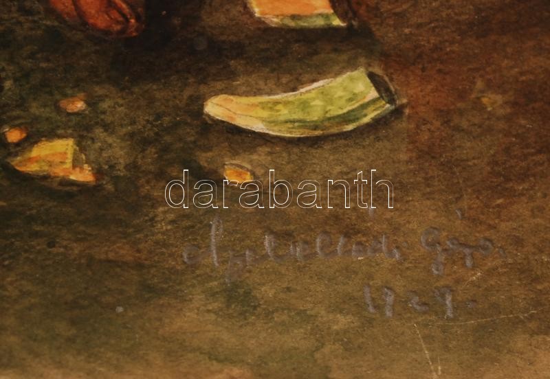 Leírás: Szebellédi Géza (?-?): Dinnyét és szőlőt evő fiúk, Murillo után. Akvarell, papír, jelzett, 29×20 cm