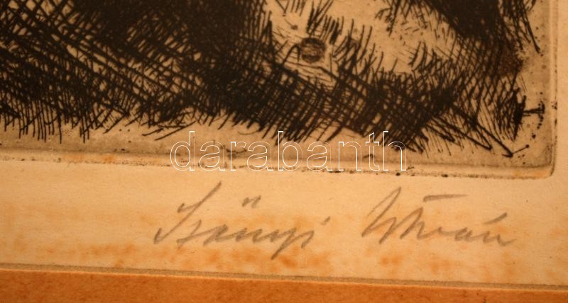 Leírás: Szőnyi István (1894-1960): Délben. Rézkarc, papír, jelzett, üvegezett keretben, 19×23 cm