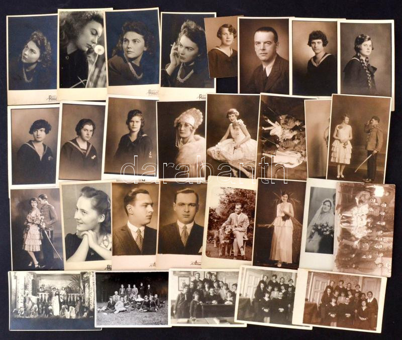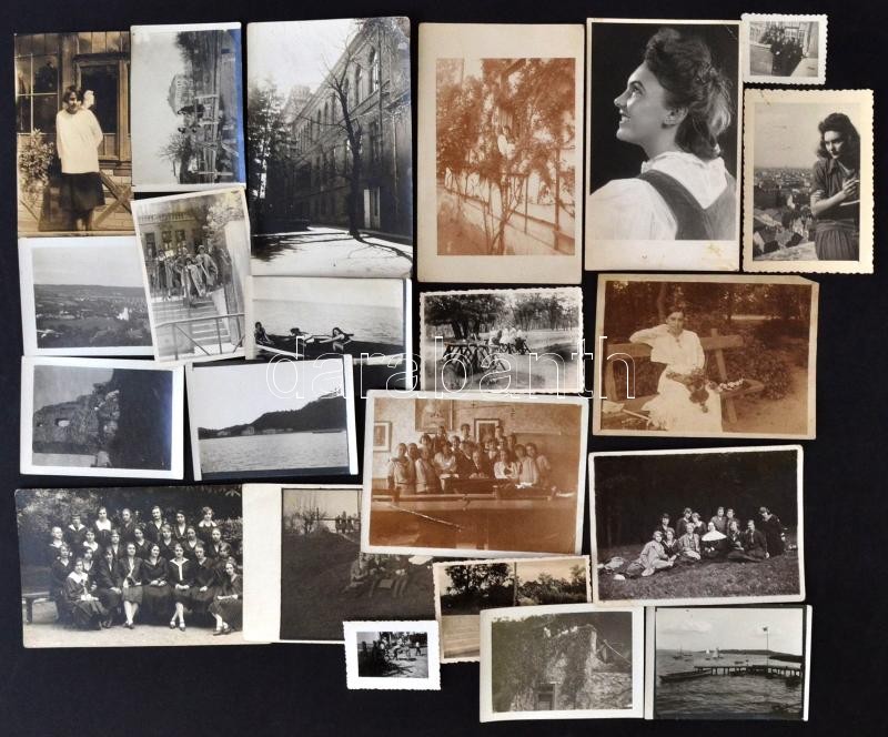 Cca 50 db. fénykép és 2 db. üres levelezőlap. Dr. Boga Dezsőné Jolika iskolaéveinek, életének emlékei. Főleg a 1920-30-as évekből származó fényképek. (1 db. 1969) Dedikálásokkal, aláírásokkal. A fotók egy része vítéz Mészáros Műterméből, Veszprém, való. A többi Rónai Foto Műterem Szaküzletből, Szeged, való. Egy kép pedig Rosbaud, Budapest, műteremből való. Iskolai fotók, kirándulások, esküvők, színházi előadások képei. Köztük a veszprémi Angolkisasszonyok Intézetéről készült két fotóval.